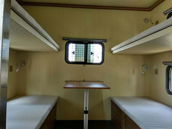 東風大型四驅(qū)越野房車滿足更多路況復(fù)雜環(huán)境使用,廂體內(nèi)裝有豪華折疊床、液晶電視、儲物柜、應(yīng)急燈、頂燈、頂置空調(diào)、床墊、被褥、燃油加熱器、頂護欄、爬梯、隱藏抽拉梯、專用房車門、中空玻璃、戶外燈。由保溫廂體、空氣調(diào)節(jié)系統(tǒng)、宿營設(shè)施、影音系統(tǒng)、電氣系統(tǒng)、通風換氣系統(tǒng)、洗漱和衛(wèi)生設(shè)施。整個廂體分為三個部分,住宿區(qū)、洗漱區(qū)、餐飲區(qū)。住宿區(qū)包括四個上下鋪,床頭燈,液晶電視,空調(diào)等。洗浴區(qū)包括臉臺,衛(wèi)生間,熱水器等。餐飲區(qū)包括無煙灶臺,可活動餐桌,洗菜盆等。也可以根據(jù)用戶的需要設(shè)計,可增加會議室,辦公區(qū)等。東風大型四驅(qū)越野房車內(nèi)飾圖片:
