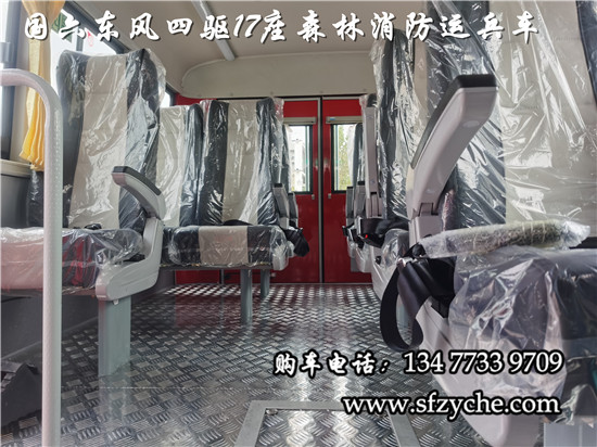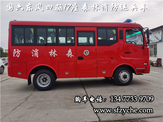 EQ6600ZT6D型17座四驅森林消防運兵車配置如下:采用東風原廠4×4越野底盤型號EQ6580KZ6T,發(fā)動機為:濰柴170馬力國六發(fā)動機WP4.1NQ170E61,排量4.088L帶增壓、法士特6擋變速箱、軸距3300mm,整車外形尺寸長寬高:(5990×2280×2750,3030)mm 驅動形式:4×4 東風分時四驅、離合助力,方向助力,斷氣剎,鼓式自動、車橋為東風德納,輪胎為8R19.5真空輪胎后雙胎、后備行李箱,工具箱2個,粘接式推拉玻璃、鋁花紋地板,中檔座椅,整車座椅安全帶,手動式外擺門,正副司機門、整車窗簾,滅火器1個,備胎一個。選裝配置:東風派恩大功率頂置空調,獨立柴油鍋爐暖風,頂置警燈帶喊話器,頂置行李架帶爬梯,后對開門等。