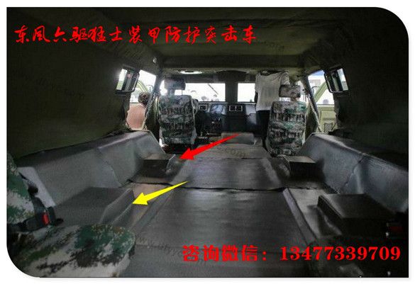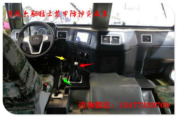 上圖是6輪驅動長軸2代猛士裝甲車駕駛艙特寫。較1代猛士裝甲車有24處改進。諸如:粗握把3幅面方向盤可以減緩駕駛員操作時的疲勞程度(1代猛士的方向盤為細握把,駕駛時間超過2小時手掌酸痛)。全新的組合儀表,將發(fā)動機轉速、車速、發(fā)動機水溫、機油壓力、蓄電池電壓顯示的更加清晰。各個功能按鍵全部改為由上至下按壓式大尺寸開關。而輪胎壓力調(diào)節(jié)開關從儀表臺左下側轉移至右側(此處改進有助于駕駛員快速操控)。