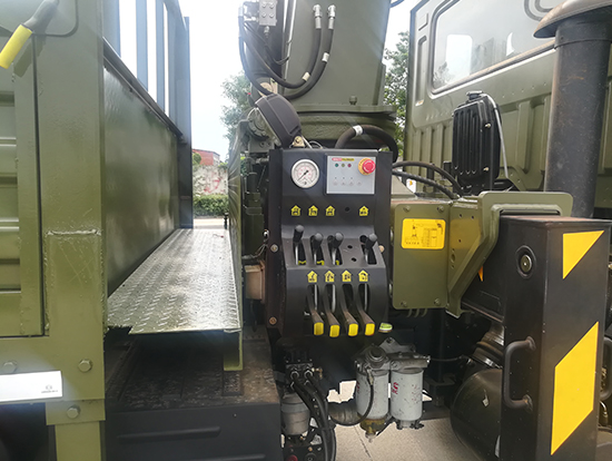 2. 采用徐工5噸折臂式隨車吊,SQZ105型徐工原廠吊機,最大起重質(zhì)量5噸,三節(jié)臂,舉升高度11米,工作半徑8米,全液壓,全回轉(zhuǎn),車廂尺寸4.25米,遠(yuǎn)程油門控制,下操作。