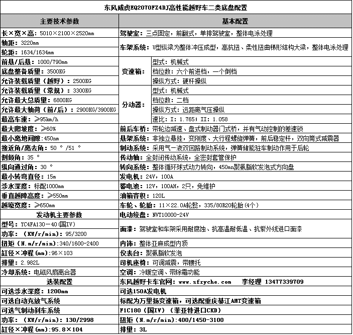 東風(fēng)EQ2070FFZ4D型高性能越野特種車是一款技術(shù)先進(jìn)、性能卓越、多功能、全天候的特種越野車,也是中國(guó)上唯一在沙漠、山區(qū)等極其艱苦環(huán)境條件下顯示高技術(shù)、高性能和高可靠性的軍用和特殊民用汽車。該產(chǎn)品,無(wú)論是越高山峻嶺、穿林海雪原,還是闖茫茫沙漠、涉沼澤泥潭,無(wú)論是用作防彈運(yùn)兵、戰(zhàn)地救護(hù),還是用作森林消防和野外勘探,它都能以超一流的越野通過(guò)能力、高涉水性,可靠耐久性和優(yōu)異的上裝適用能力,令世人嘆為觀止,當(dāng)之無(wú)愧地成為挑戰(zhàn)越野極限的明星。如需了解更多EQ2070FZ4D型越野四驅(qū)汽車的詳細(xì)參數(shù)和配置請(qǐng)立即撥打銷售熱線:13477339709 李經(jīng)理 0722-7053060 業(yè)務(wù)QQ:530233927,微信號(hào):13477339709 ,東風(fēng)越野卡車網(wǎng)址:m.hck388.net