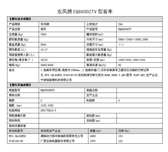 EQ6600ZTV四驅越野客車圖片,國五排放四驅10座越野客車價格,6米四驅客車多少錢,東風四驅越野客車參數(shù)配置: 1.底盤型號EQ6550KZ5T,發(fā)動機型號:YC4S140 50 國五排放 2.整車外形尺寸長寬高:(5980×2060×2890)mm 驅動形式:4×4 東風分時四驅 3.離合助力,方向助力,斷氣剎,鼓式自動,駕駛區(qū)域空調 4.車橋為東風德納,輪胎為265/70R19.5型越野輪胎,ABS 5.工具箱,前置防裝杠,粘接式推拉玻璃,發(fā)動機底板防護 6.鋁花紋地板,中檔皮革座椅10個+1個折疊座椅,整車座椅安全帶,手動式外擺門,正副司機門,后置雙開門,東風原廠派恩頂置空調 , 7.窗簾,滅火器兩個,備胎一個,獨立燃油暖風系統(tǒng)帶兩個雙面王出風口 8.其它為EQ6600ZTV型四驅越野客車標配。具體配置參數(shù)參照(附件一)。 成品合格證、全額上戶發(fā)票、隨車工具、隨車文件各一套。